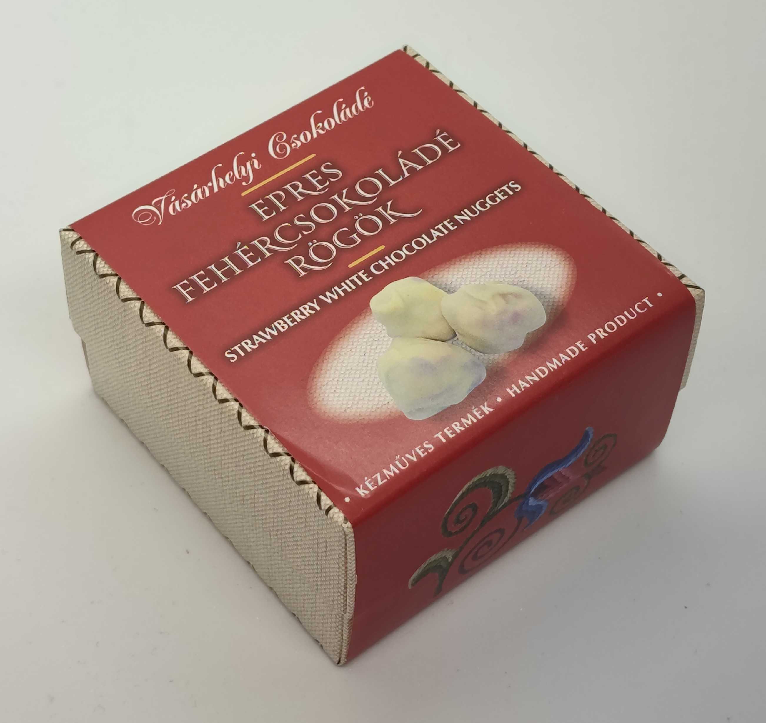Összetevők: fehércsokoládé (kakaóvaj, nádcukor, tejpor, emulgeálószer: szója lecitin, természetes vanília, kakaó szárazanyag tartalom: 35%), liofilizált eper.