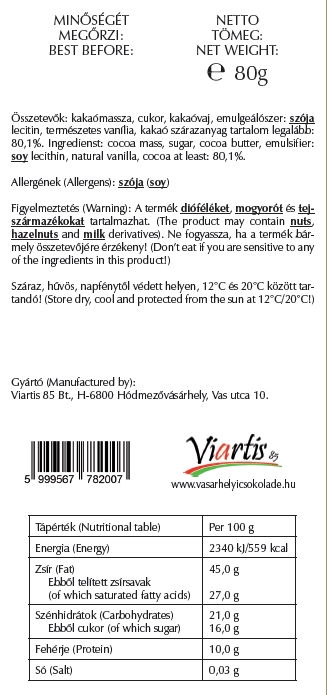 Összetevők: Kakaómassza, kakaóvaj, cukor, emulgeálószer: szójalecitin, természetes vanília, kakaó szárazanyag tartalom legalább 80,1%.