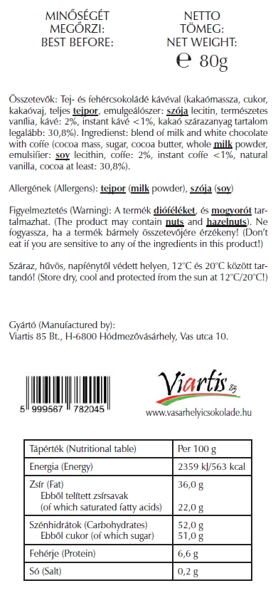 Összetevők: Tej- és fehércsokoládé (kakaómassza, cukor, kakaóvaj, teljes tejpor, emulgeálószer: szója lecitin, természetes vanília, kakaó szárazanyag tartalom legalább 30,8%), kávé: 2%, instant kávé < 1%.