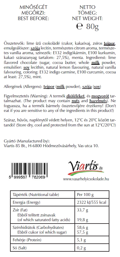 Összetevők: Lime ízű csokoládé (cukor, kakaóvaj, zsíros tejpor, emulgeálószer: szója lecitin, természetes citrom aroma, természetes vanília aroma, színezék: E132 indigókármin, E100 kurkumin, kakaó szárazanyag tartalom legalább 27,5%), menta.