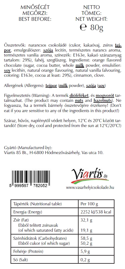 Összetevők: Narancs ízű csokoládé (cukor, kakaóvaj, zsíros tejpor, emulgeálószer: szója lecitin, természetes narancs aroma, természetes vanília aroma, színezék: E163e indigókármin, E100 kurkumin, kakaó szárazanyag tartalom legalább 29%), fahéj, szegfűszeg.