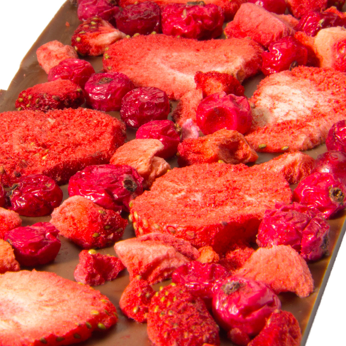 Tejcsokoládé liofilizált eperrel és liofilizált piros ribizlivel