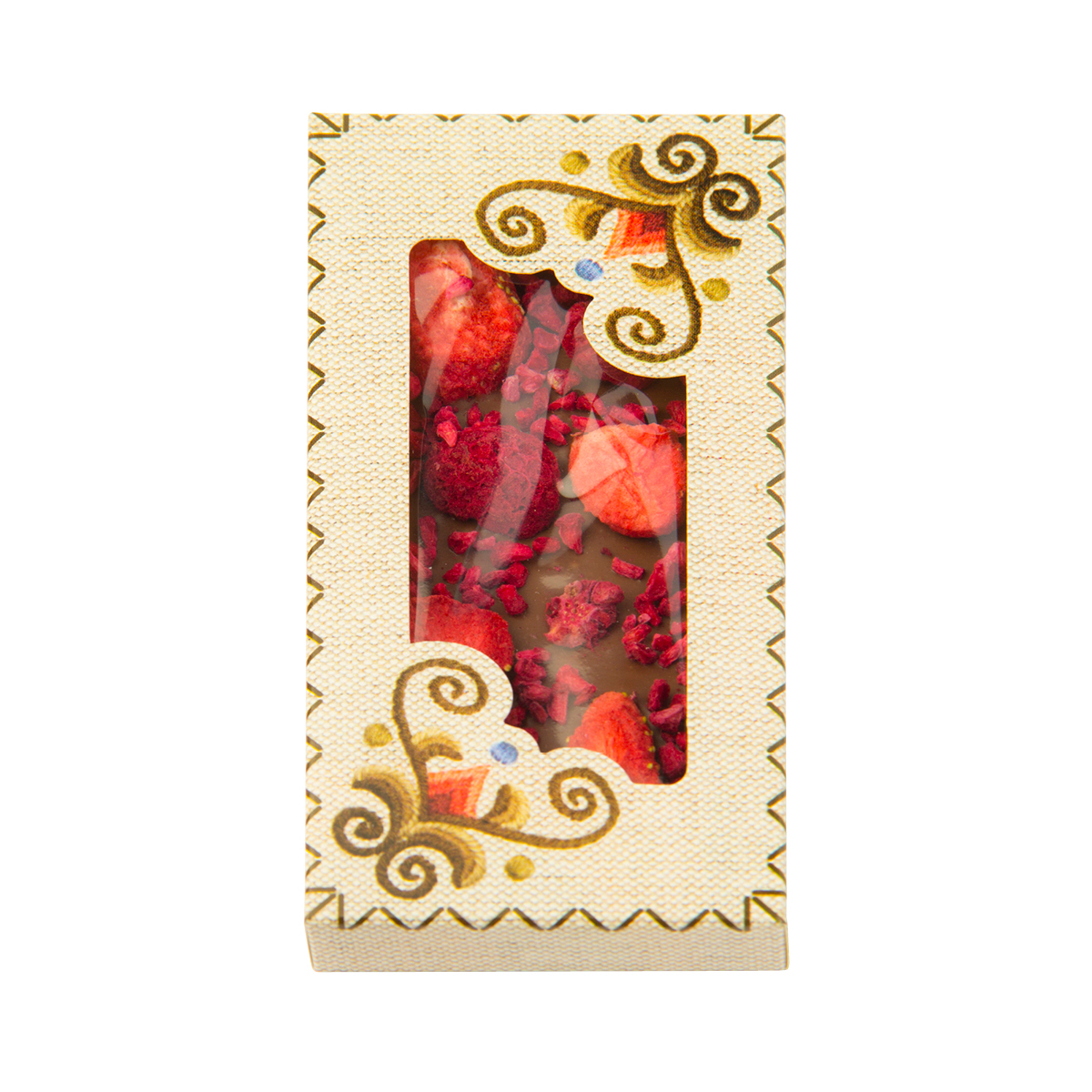 Tejcsokoládé liofilizált málnával és liofilizált eperrel