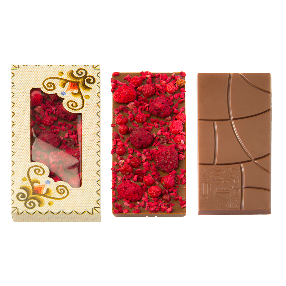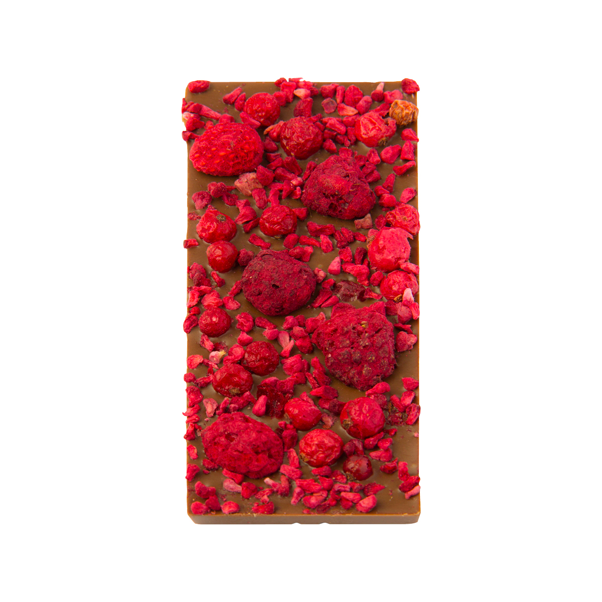 Tejcsokoládé liofilizált málnával és liofilizált piros ribizlivel