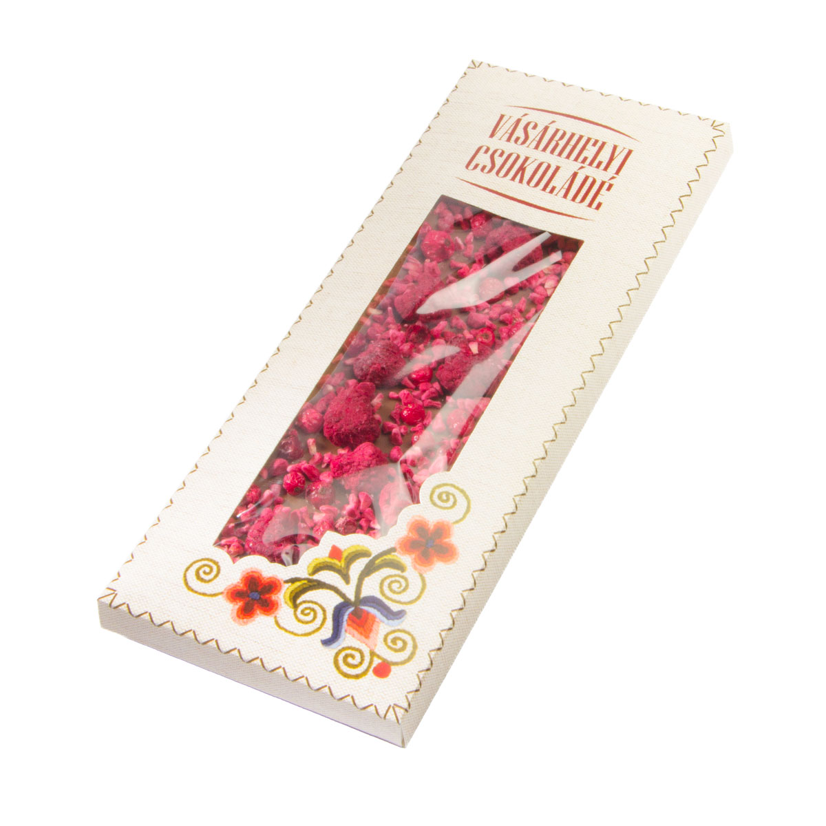 Tejcsokoládé liofilizált málnával és liofilizált piros ribizlivel